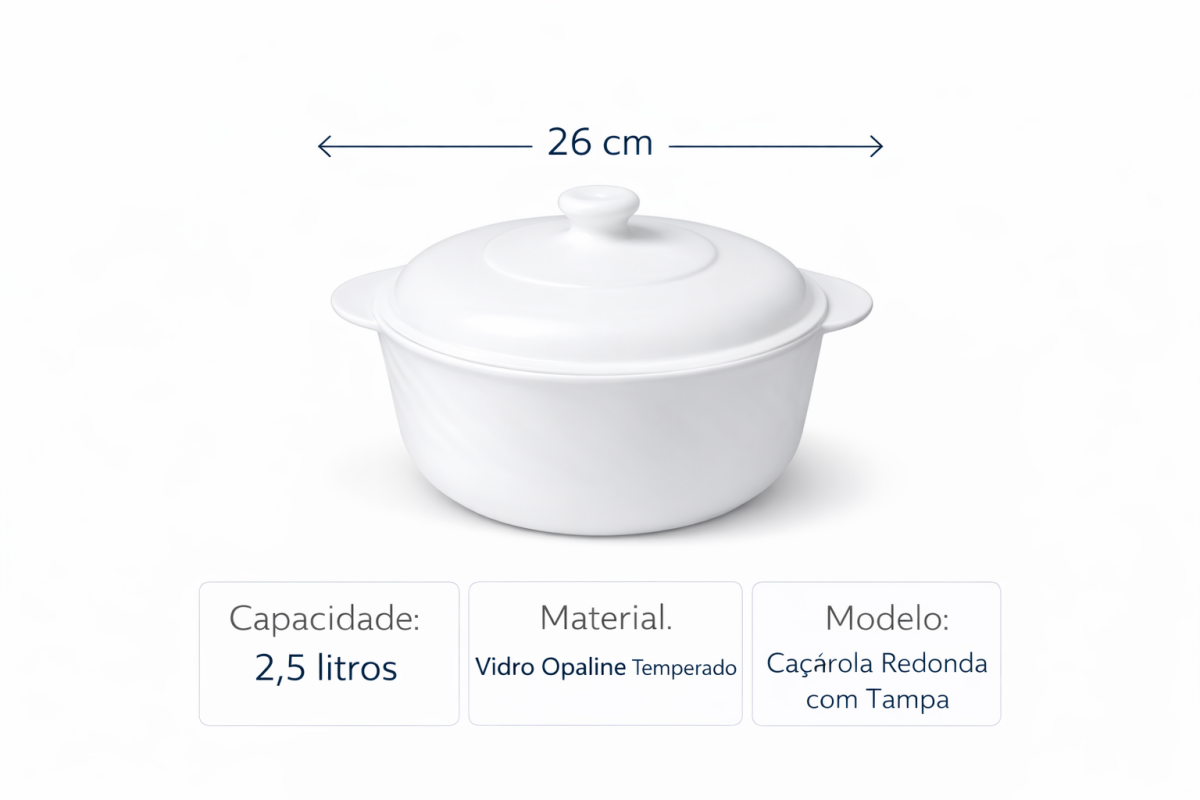 A caçarola redonda com tampa em vidro opaline temperado é ideal para preparar, servir e manter alimentos aquecidos com praticidade e elegância. Com 26 cm de diâmetro e capacidade de 2,5 litros, é perfeita para o preparo de sopas, caldos, massas, molhos e diversas receitas.