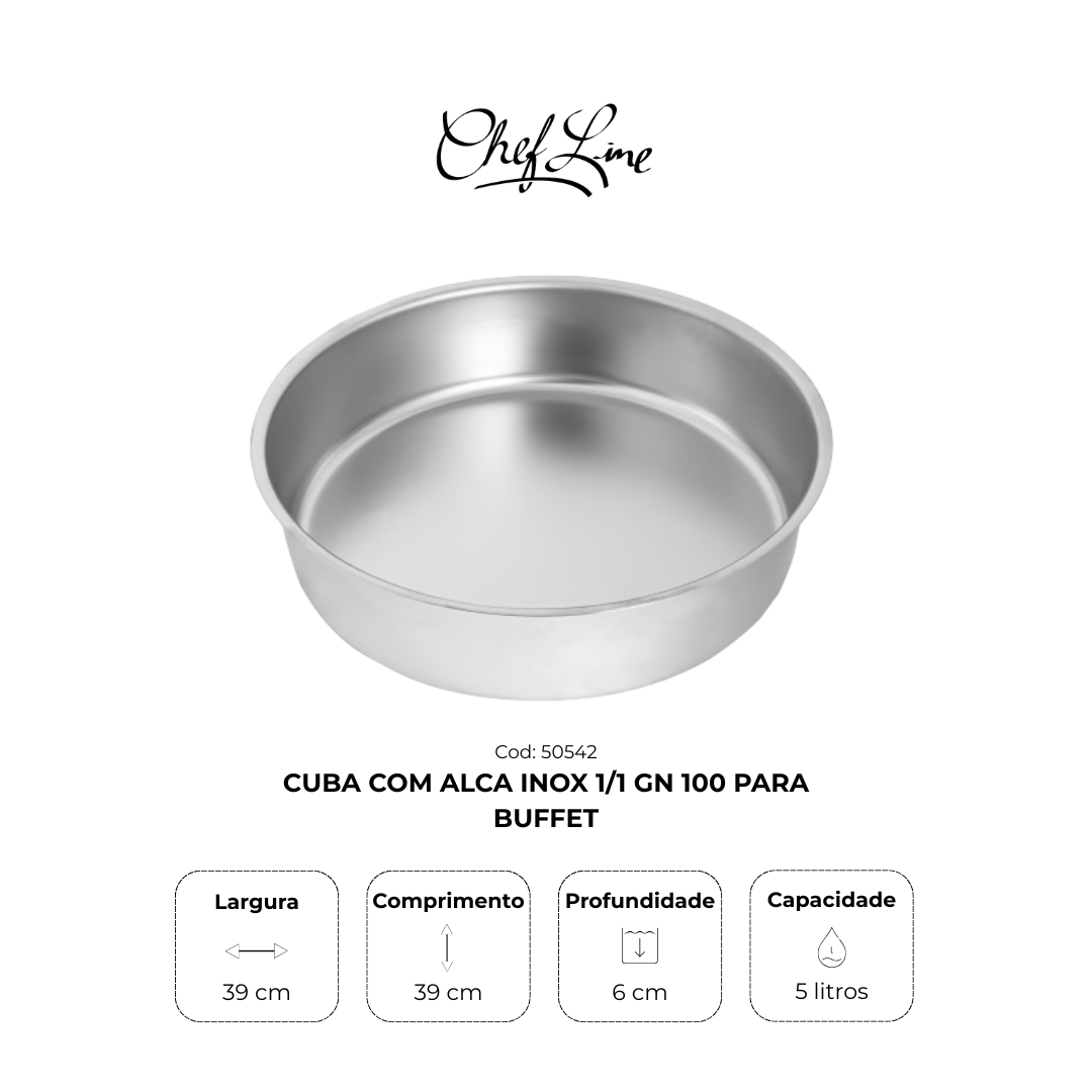A Cuba para Réchaud Redondo Chef Line é ideal para manter alimentos aquecidos com praticidade e eficiência em buffets, eventos e serviços de alimentação. Produzida em aço inox, oferece alta resistência, durabilidade e fácil higienização, sendo perfeita para uso em restaurantes, hotéis e serviços de catering.