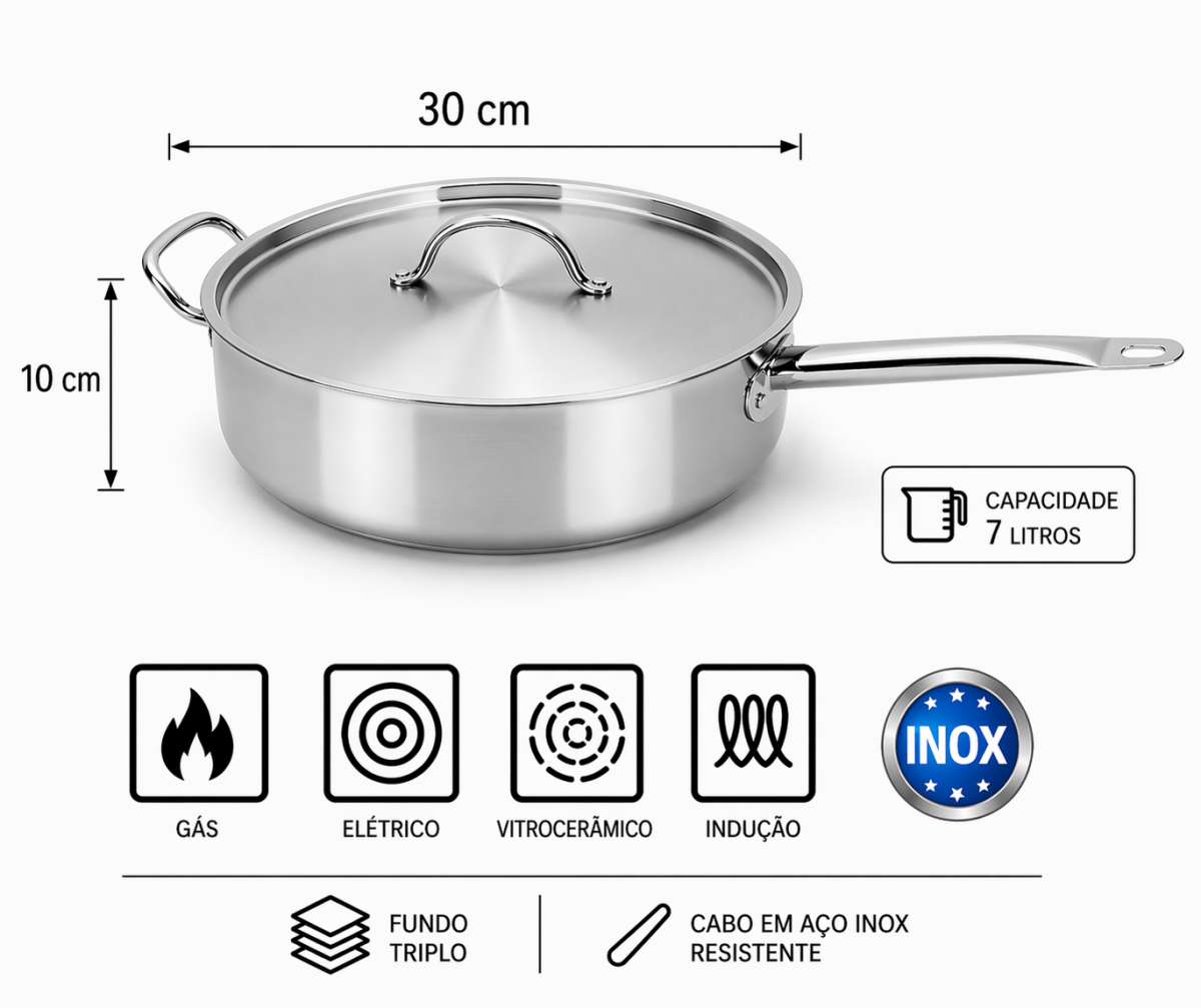 Panela 30 CM 7L Com Tampa em Inox e Fundo Triplo