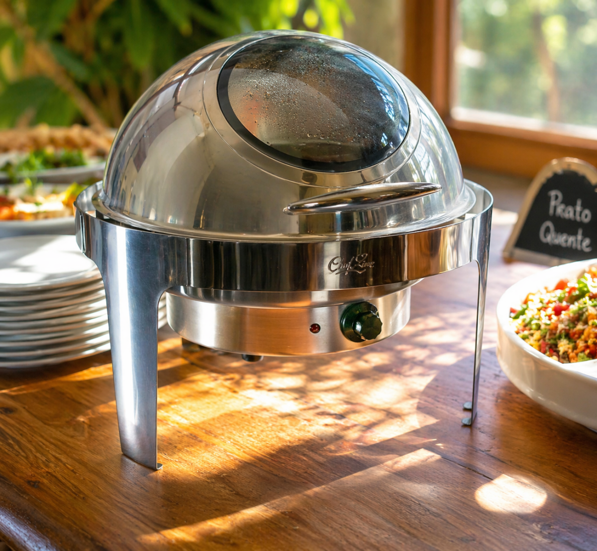 O rechaud de aquecimento elétrico redondo com tampa com visor de vidro articulada e display que controla a temperatura é uma excelente opção para restaurantes, buffets e hotéis, que precisam manter os alimentos aquecidos por longos períodos de tempo.