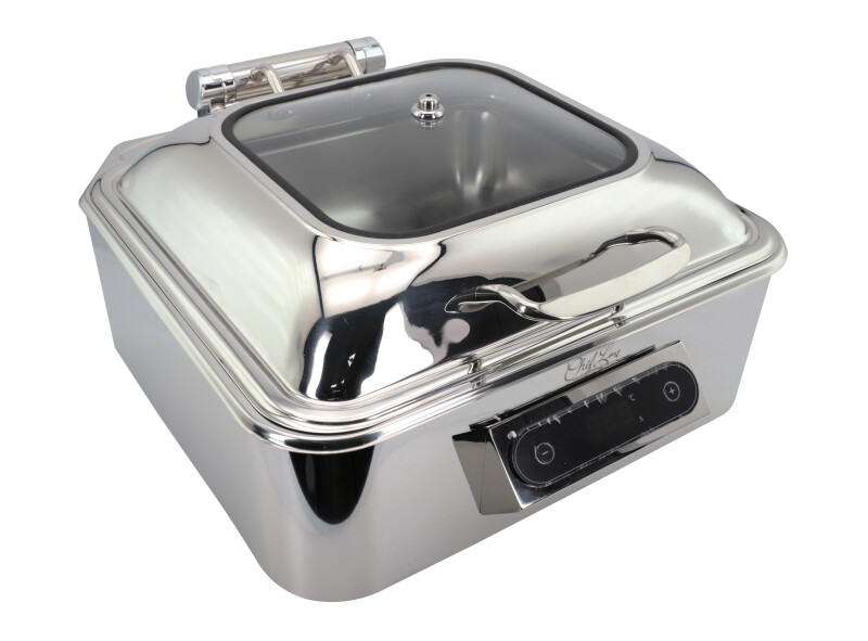 O rechaud de aquecimento elétrico retangular e tampa com visor de vidro articulada e display que controla a temperatura é uma excelente opção para restaurantes, buffets e hotéis, que precisam manter os alimentos aquecidos por longos períodos de tempo.